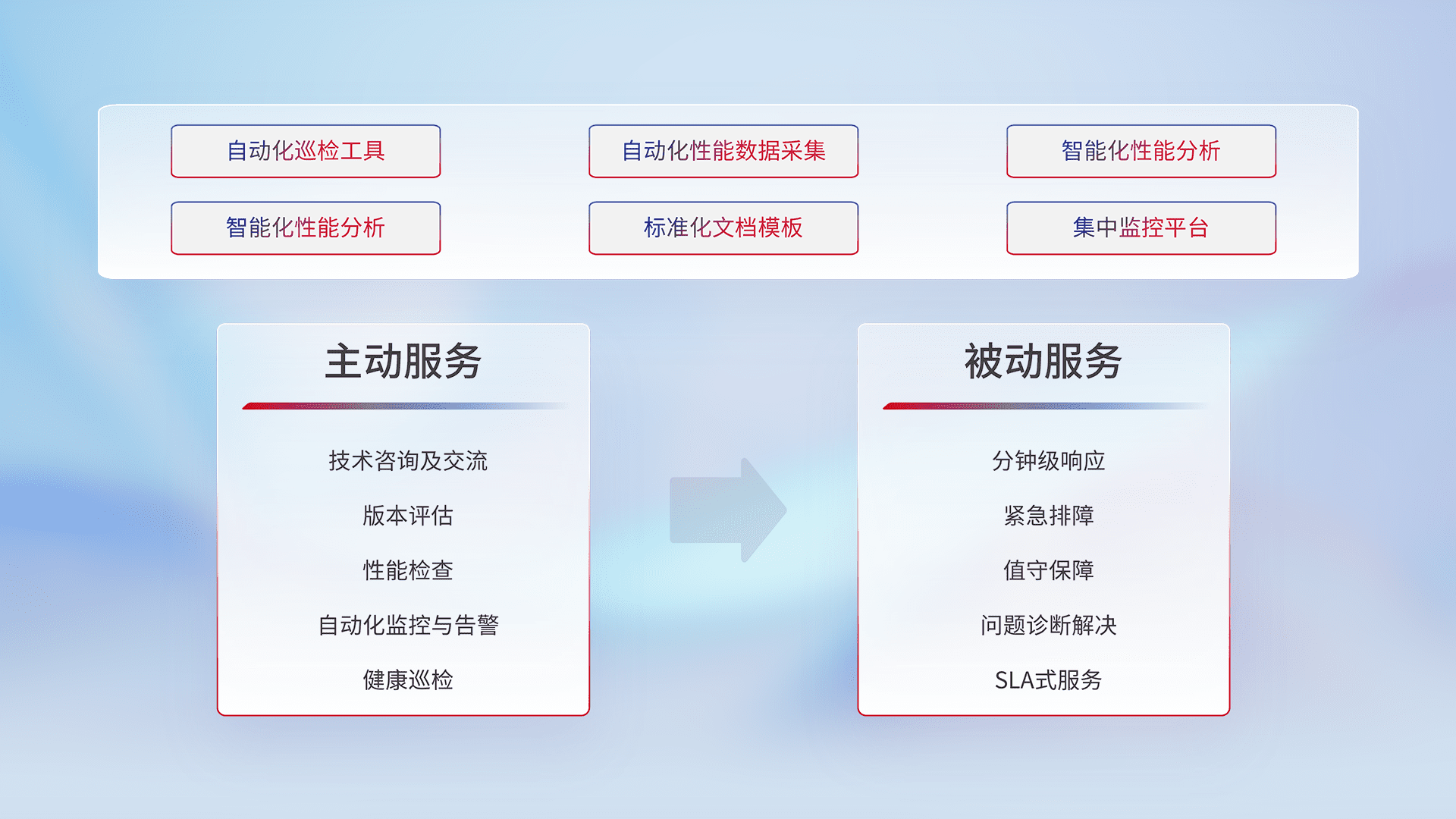 智能化工具和标准化文档,,,,保障服务质量,,,提供主动服务(包含技术咨询、、、版本评估、、、性能检查、、自动化监控与告警、、、健康巡检)和被动服务包含(分钟级响应、、、、紧急排障、、值守保障、、问题诊断解决、、、SLA服务)。。。
